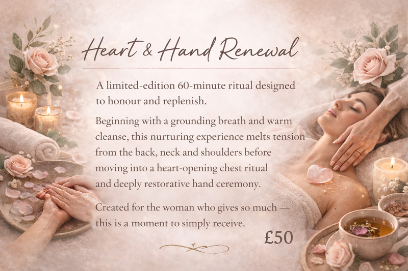 A limited-edition 60-minute ritual designed to honour and replenish. Beginning with a grounding breath and warm cleanse, this nurturing experience melts tension from the back, neck and shoulders before moving into a heart-opening chest ritual and deeply restorative hand ceremony. Created for the woman who gives so much ā this is a moment to simply receive.